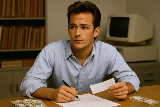 Young Luke Perry reviewing paycheck at office desk in the 1990s.