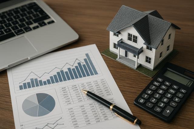 Real estate model with financial charts, calculator, and laptop on desk.